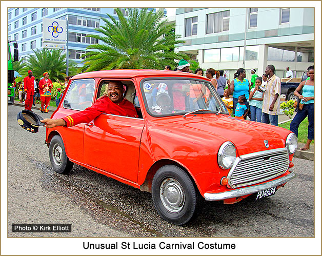 While most carnival revelers dress in fancy costumes to go make merry in the streets this St Lucia Carnival sailor just may have donned the ultimate costume for any carnival in St Lucia. Yeah, that’s right – as Fisher – the guy at the wheel likes to call his little red Mini Morris The Ultimate St Lucia Carnival Costume.